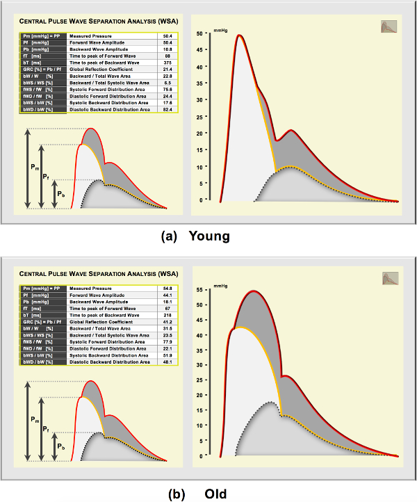 Wave Separation Analysis (WSA) in a young healthy adult (a) and an old hypertensive patient (b). WSA allows the decomposition of the central pulse wave into its forward (Pf) and backward (Pb) components.