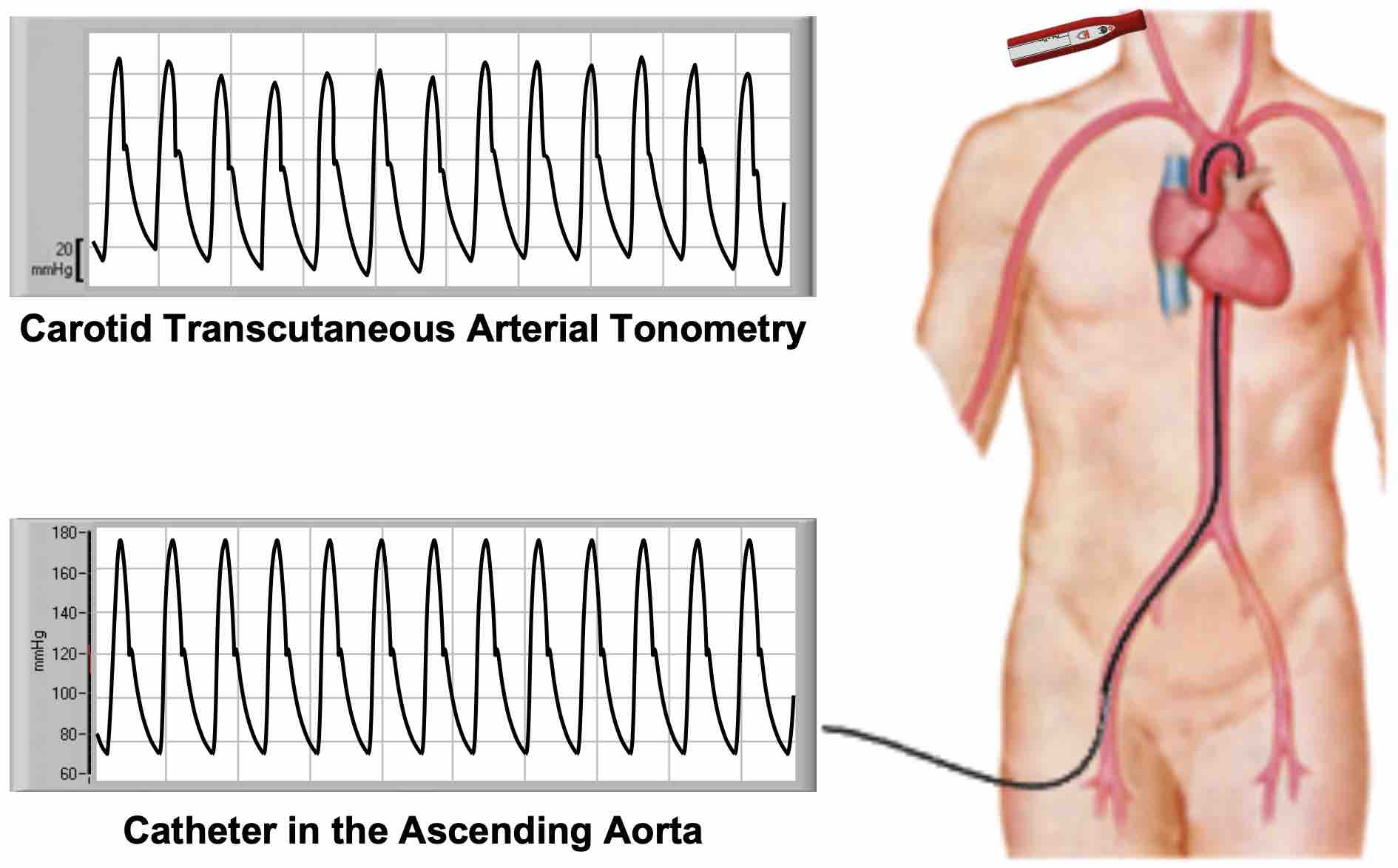 In a second step, the pressure waves assessed with the PulsePen on the carotid artery were compared with intra-aortic pressure waves.1 The intra-arterial catheter was placed at the origin of the ascending aorta and the transcutaneous tonometer probe on the common carotid artery.
