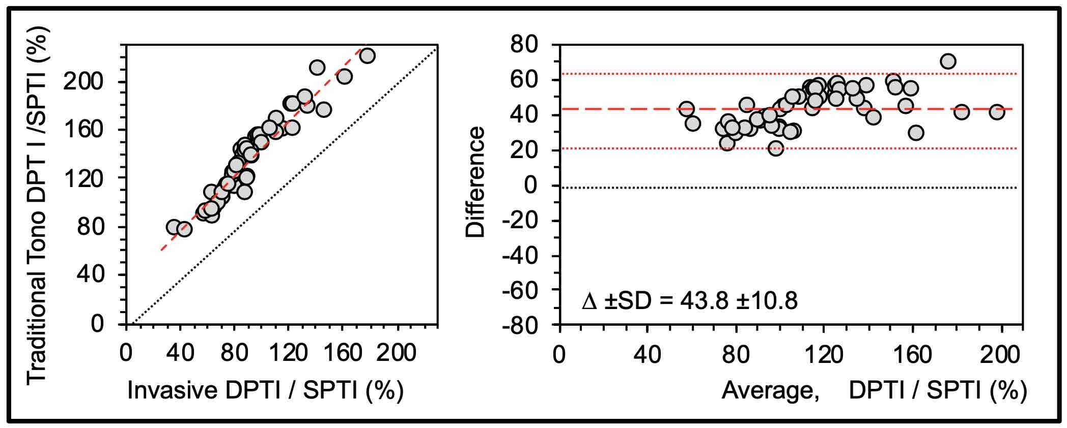 This “traditional” method provided significantly higher SEVR values than the reference invasive SEVR: average of differences ±SD = 44% ±11% (limits of agreement: 23% to 65%).
