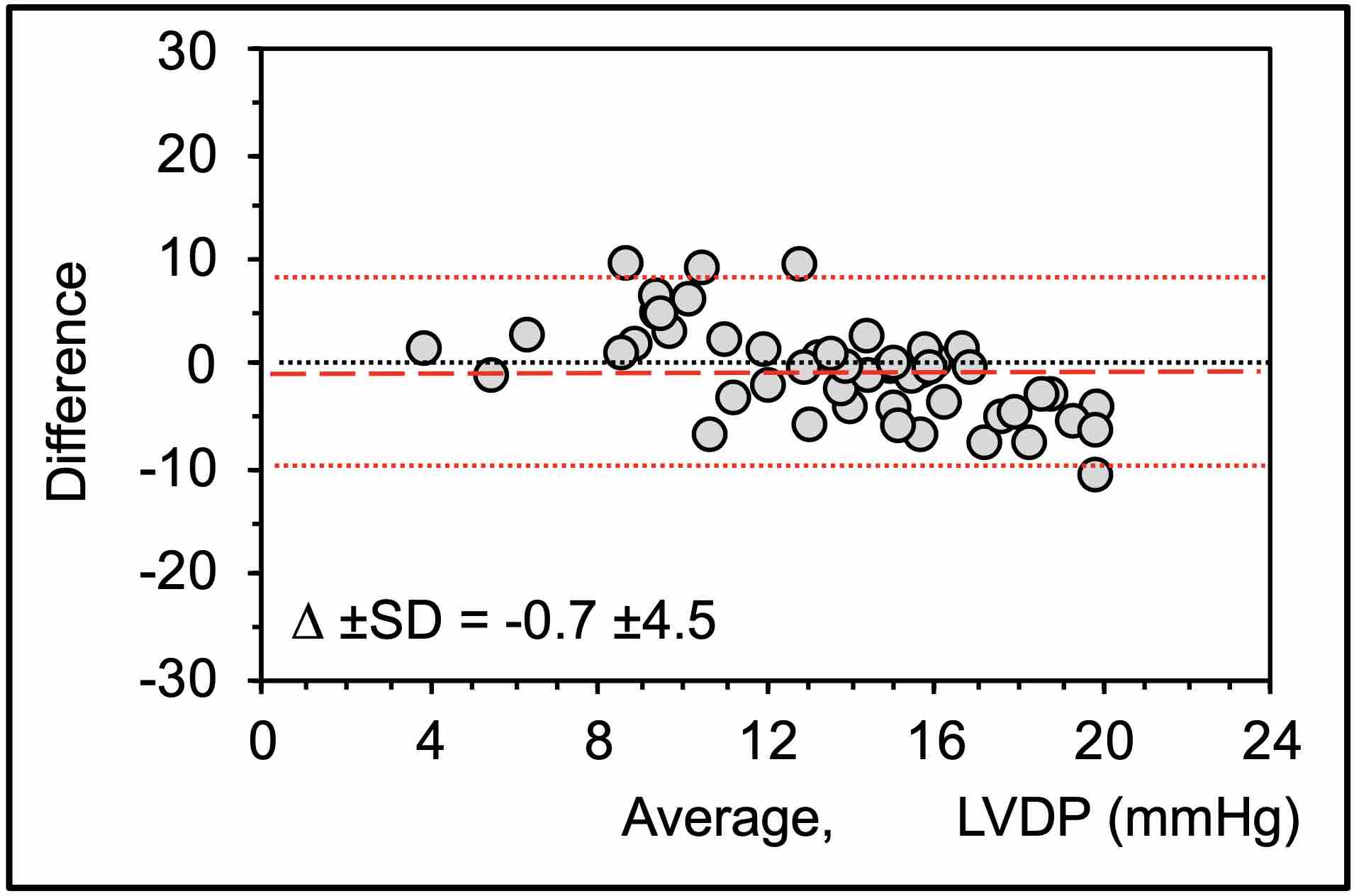 Bland-Altman plot shows differences observed between LVDP values recorded by ventricular catheterization and estimated by PulsePen tonometer according to the average values. The area delimited by red dotted lines shows the mean values of differences (red dashed lines) ±1.96 standard deviation (SD) of mean SEVR values.