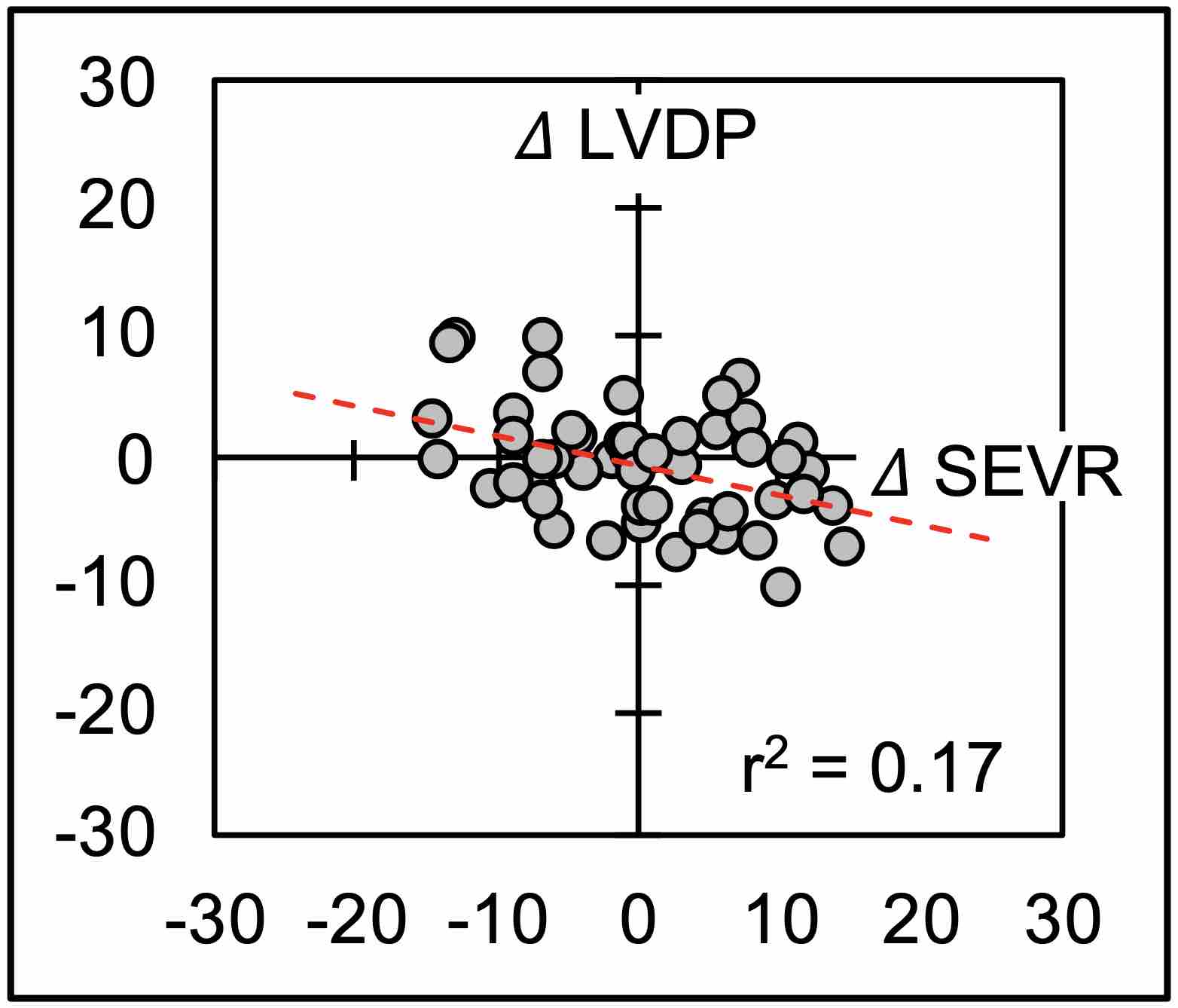 Relationship between differences in subendocardial viability ratio (SEVR) estimated with invasive catheterization and with carotid applanation tonometry by PulsePen device and respective difference between left ventricular mean diastolic pressure (LVDP) measured with invasive and transcutaneous methods.