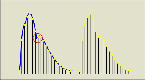 theoretically at each sampling interval exactly the value of the original signal is captured. Actually, the number of values that the yellow